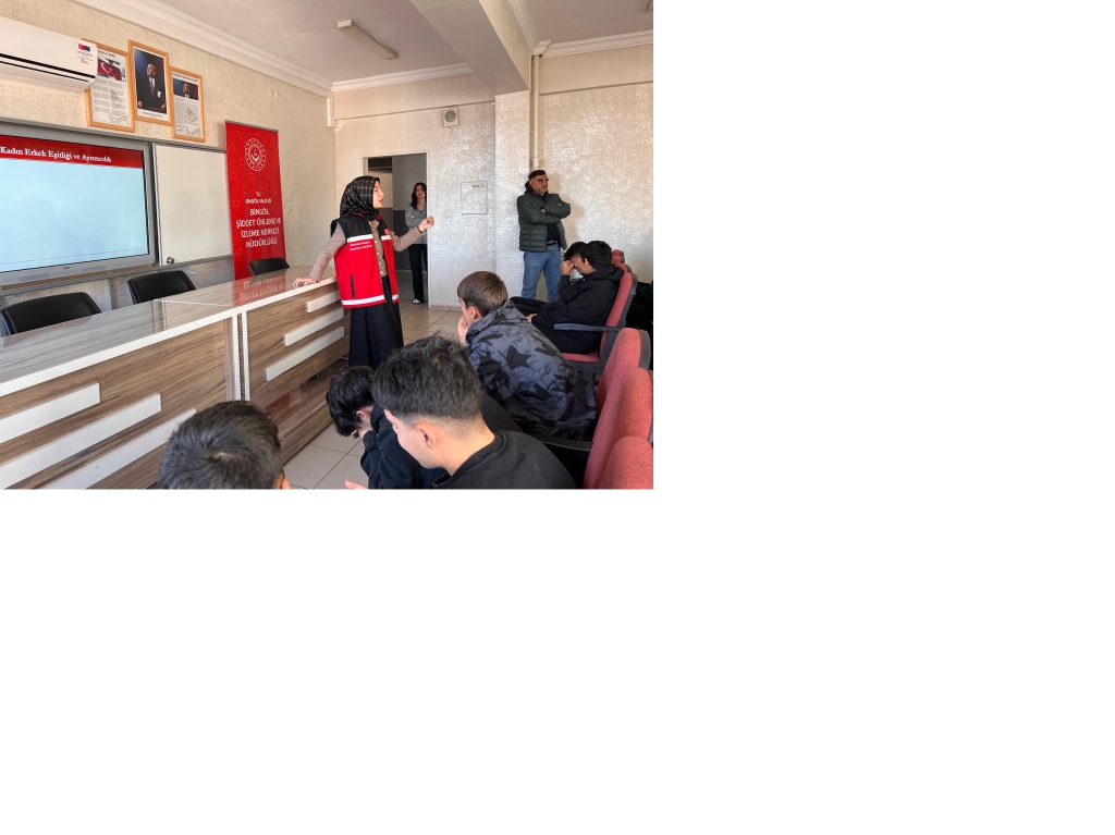 25 Kasım Kadına Yönelik Şiddete Karşı Uluslararası Mücadele Günü kapsamında Bingöl Şiddeti Önleme ve İzleme Merkezi(ŞÖNİM)'den eğitim vermek üzere uzman sosyolog ve psikolog çalışmacılar okulumuz konferans salonunda 11 ve 12. sınıflara yönelik seminer düzenlemişlerdir.